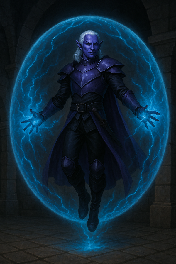 • The party entered the main hall to see a drow wizard hovering on the second level, surrounded by a glowing blue shield.