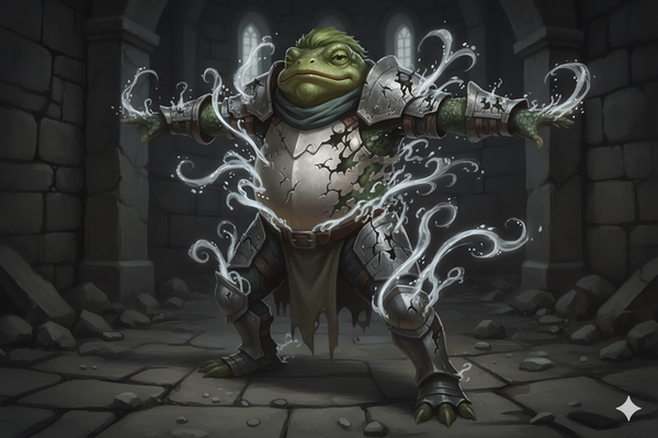 In the main hall, they met Drenn, a drow wizard hovering with permanent Shield and Fly spells, who offered Manshoon's secrets in exchange for peaceful departure--revealing Manshoon's decaying clone body sought a flesh-swap ritual in Chult's jungles. After negotiating to remove Glenn's curse and take petrified Cyrus, Diedric cast Remove Curse, sending Glenn into a vision of his father's wisdom about wielding identity as a shield. Glenn chose to embrace his frog transformation, emerging in his true form: tall, olive-skinned, with spring-green hair.