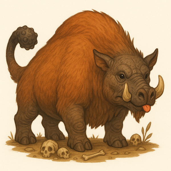 - Barely noting that the next room bore six pillars, one holding a rough stone cube, the party was charged by a dark brown, bloated buffalo, dinosaur, warthog, and hippopotamus hybrid. It had the worst stench you've ever smelled: like bloated, rotting death mixed with swamp gas and skunk musk. A part of its shoulder was missing flesh, showing bone beneath. Undead, likely dredged from the bottom of an ocean.