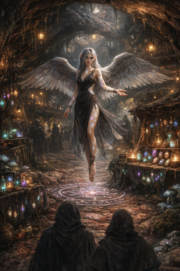 - An avariel woman, surrounded by vials and pendants containing runes glowing in different colors, spoke with possible customers.